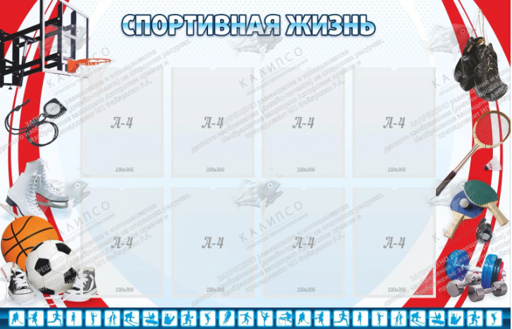 Стенд "Спортивная жизнь" стенд на ПВХ основе без профиля Размеры: 1.4x0.9 Материал: пластик ПВХ 3мм, пленка с фотопечатью 720 dpi, ламинирующая пленка.Карманы - ПЭТ 0,5 мм, крепление на двусторонний скотч....
