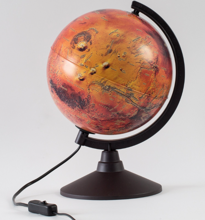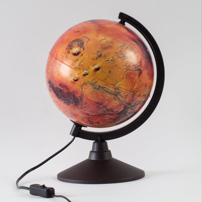 Глобус Марса с подсветкой d=32 Диаметр 32 см. Светодиодная подсветка. Работает от сети. Рельеф на шаре (карте) Нет Тип карты Физическая (общегеографическая) Карта Марс Тип подставки Настольная Материал подставки Пластик...